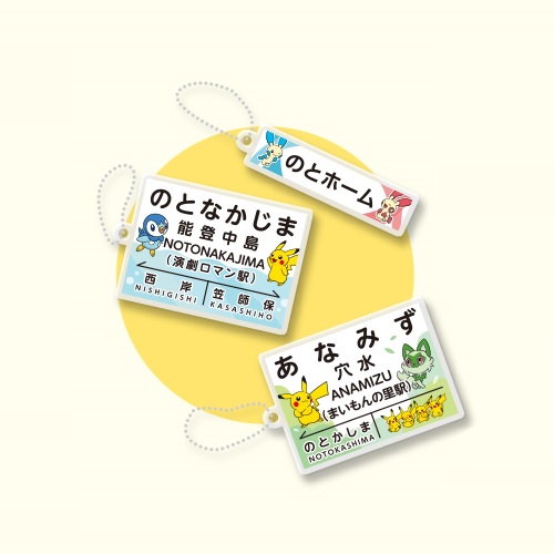 のと鉄道の「七尾駅」、「能登中島駅」、「穴水駅」にあるポケモンの駅名標のアクリルキーホルダー。